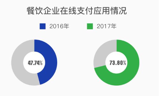 对比微盟研究院发布的《2016上半年中国智慧餐饮服务市场发展研究报告》,报告数据显示,2017年餐饮企业应用移动支付的比例达到73.8%,而2016年这一数据为47.74%;2017年餐饮企业应用在线点餐的比例从2016年的37.25%提升到50.6%。这表明,餐饮企业的智慧化应用程度正在提升。