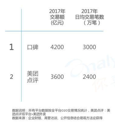 根据易观报告监测的数据,2017年全年,口碑的GMV在4200亿元左右,较去年同期增长142.6%。本月,美团点评CEO王兴也曾对外透露了美团业绩数据。2017年,美团点评交易额达到3600亿元,比2016年同期增长了50%。以日交易笔数排名,口碑的日交易笔数突破3000万笔,超越美团点评的2400万笔。在GMV和日交易笔数这两个关键指标上,口碑均位列行业第一。