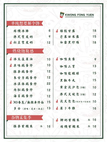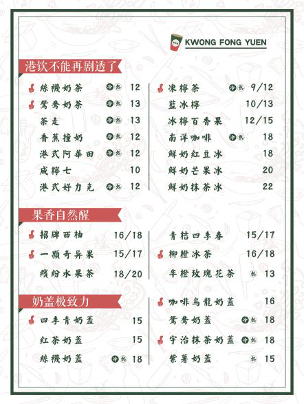 从广芳园的菜牌来看,分类就较为明确。作为茶饮+小食的品牌,在食和饮的方面做出了明确的区分。同时,在饮品方面,又着重进行了细分:以港饮、奶盖、果香、谷物几个分类,很容易让顾客做出偏好选择。