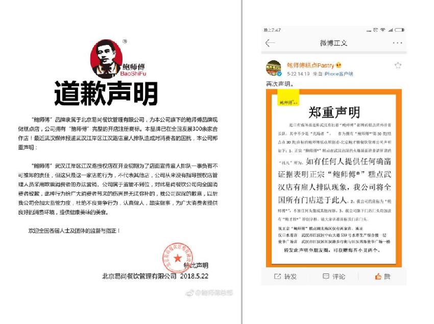 5月22日中午12:20分,一家微博名为“鲍师傅总部”,署名为北京易尚餐饮管理有限公司的微博账号发出道歉声明,表示公司对雇人排队一事负有不可推卸的责任,但同时声明:只是这一家店的行为,不代表其他店。