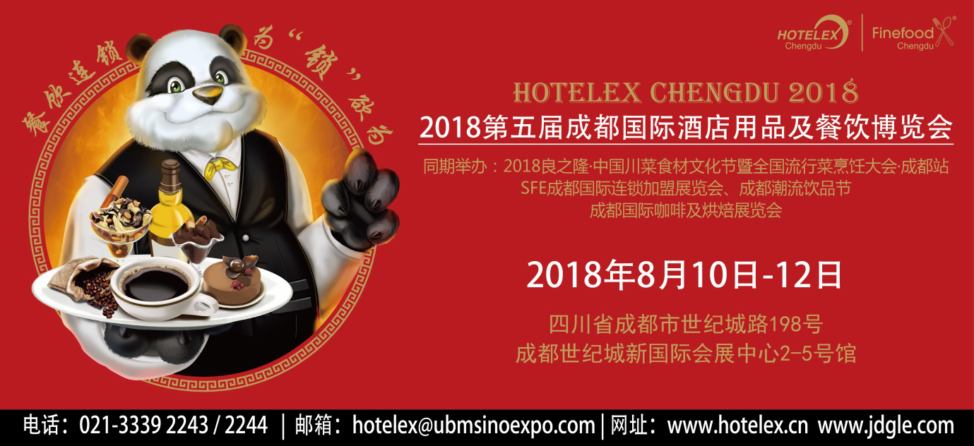 第五届成都国际酒店用品及餐饮博览会(简称:HOTELEX Chengdu 2018)将于2018年8月10日至12日在成都世纪城新国际会展中心2-5号馆举行(四川省成都市世纪城路198号)。同期还将举办2018良之隆中国川菜食材文化节暨全国流行菜烹饪大赛-成都站、SFE成都国际连锁加盟展览会、成都流饮品节以及成都国际咖啡及烘焙展览会。作为上海国际酒店及餐饮业博览会的地方展,立足四川蓉城,辐射西南地区,旨在为客户提供最丰富优质的选择。