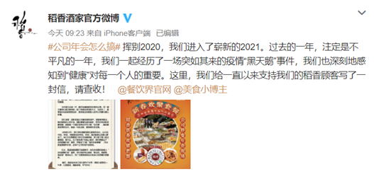 1月26日,稻香酒家在其官方微博特别发布了“一封致顾客的信”,意在以书信形式正式发布其“派对团餐外卖新品”。信中提到:“为了规避疫情之下不必要风险,迎合用户的线上需求,我们特推出了‘派对团餐外卖’服务。”并在书信中真诚邀请顾客抢先体验“派对团餐外卖”。