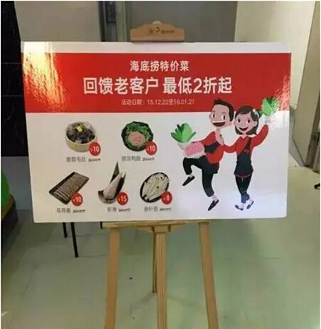 在无锡海底捞餐厅,正在以“回馈老客户最低2折起”的名义,于2015年12月22日到2016年2月21日期间,推出一系列特价菜。据网友曝出的菜价单,涉及这场促销的菜品,主要有脆脆毛肚、虾滑、鸭肠、乌鸡卷等几种,但价格却异常低廉,仅标价8元到15元不等。