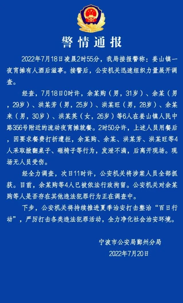 7月20日,宁波市公安局鄞州分局通报“多名男子打砸烧烤摊”事件,表示公安机关已将涉案人员全部抓获。目前,余某购等涉案人员4人已被依法行政拘留。