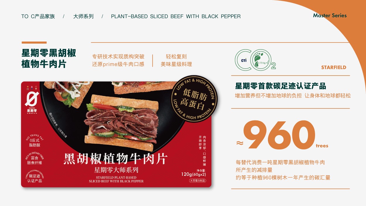 值得注意的是,目前「星期零」已进入整肉塑性阶段,可创造出具有整块肉纹理的产品,通过间断式针织风味和精进酶法交联技术,达到模拟肌纤维的效果,形成色、香、味与真肉媲美的植物肉,为国人提供健康和美味两全的饮食体验。该技术的代表产品“黑胡椒植物牛肉片”不仅可以开袋即食,还可通过轻烹搭配主食享用,满足更多元的植物蛋白餐食需求。在不牺牲风味口感的基础上,产品通过添加植物性配料,解决了大部分传统腌制肉类产品添加“防腐剂”“亚硝酸盐”的固有缺点,并具有0反式脂肪酸、低脂高蛋白等优势,凭借出色的体验获得市场好评。同时这款产品,经过华测碳足迹认证,对比同类动物肉产品碳排放约减少84%。