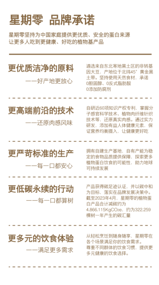 在品牌影响力方面,「星期零」以成为“超级生活方式品牌”为长期目标,在当下的发展阶段,力求与用户共同探索更好吃的健康饮食生活方式,并积极承担其作为本土领军植物蛋白品牌的责任,为行业发声,加强消费者认知,助力行业健康持续发展。