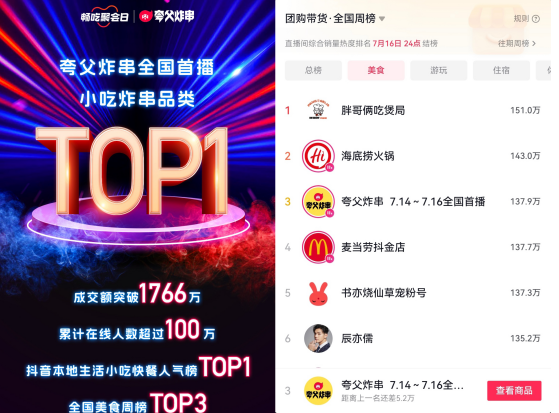 7月14日-7月16日,抖音「畅吃聚会日」联合小吃炸串头部品牌夸父炸串,开展了一场以夜市为主题的沉浸式场景直播。本场直播累计成交额突破1766万,累计在线观看人数超过100万,作为抖音本地生活小吃快餐人气榜TOP1品牌,夸父炸串迅速登上全国美食周榜前三、小吃炸串行业第一!