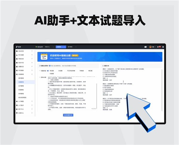 沃才3.0版本通过运用先进的人工智能技术,推出了AI助手和文本试题导入功能,帮助企业一键研发考题及轻松创建在线考试。在使用中,只需将内部培训资料文本粘贴输入,仅几秒钟,AI助手就可以根据资料内容自动生成完整试题,生成后试题可在平台中直接引用到考试场景。这极大地节省了企业培训人员在出考题和上传试题的时间,让培训工作效率更卓越。
