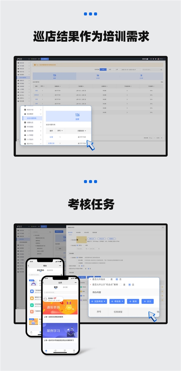在解决方案一体化上,我们通过实现证书作为员工的人事调动及日常排班条件,巡店结果作为培训需求依据,考核任务作为门店监管及店长运营助手,从而提升了人事审批及排班流程的效率,解决了信息孤岛问题,并且帮助企业精准定位门店管理存在的不足之处,以此来制定有效的培训计划。