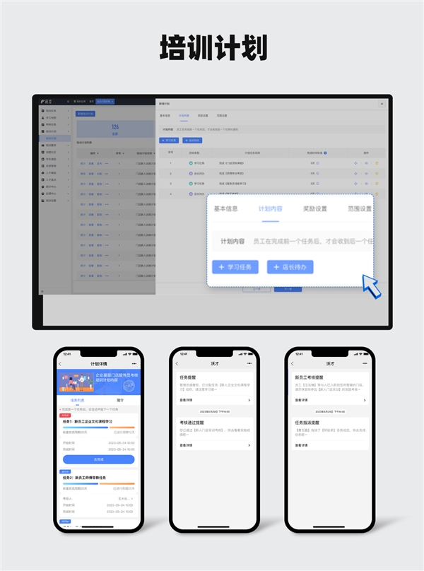 沃才3.0在流程自动化的实现上,我们推出了“培训计划”功能。它可以将多个学习任务或店长待办组成一个任务链,员工完成上一个任务后会自动触发下一个任务,按规划学习,用考试检核;训练员/师父/管理者可实时关注,线上线下进度一致,实现了多种培训场景的流程自动化。
