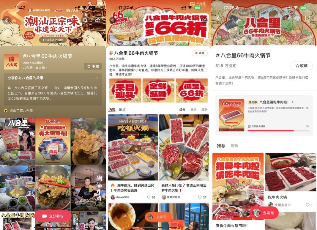 本次八合里66牛肉火锅节首次尝试16小时不间断直播,吸引海量网友在线围观和互动。抖音直播间里,八合里牛肉火锅不仅发放低至66折的优惠券,同时通过抖音“心动大牌日”专题页发起打卡任务,直播间发放超值礼品。多重优惠和互动活动叠加,仅6月3日单日,八合里牛肉火锅直播间GMV突破3181w,同期登上抖音全国日榜美食榜TOP1、抖音全国屠榜总榜TOP1,霸占抖音全国周榜第一。
