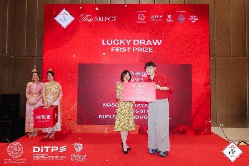 随后进行的抽奖环节将气氛再次推向高潮。共20位幸运嘉宾通过现场抽取的手环编号获得了由SIAM DREAM梦回暹罗、泰国蔡合盛、泰京国际、泰国国家旅游局等赞助的丰富奖品,包括泰式按摩体验券、调料礼包、香米糯米礼包、旅行行李箱等,以及重磅大奖——由泰国国家旅游局赞助的赛伊皮皮岛度假村及梅森芭提雅酒店豪华别墅住宿套餐。现场欢呼不断,惊喜连连。