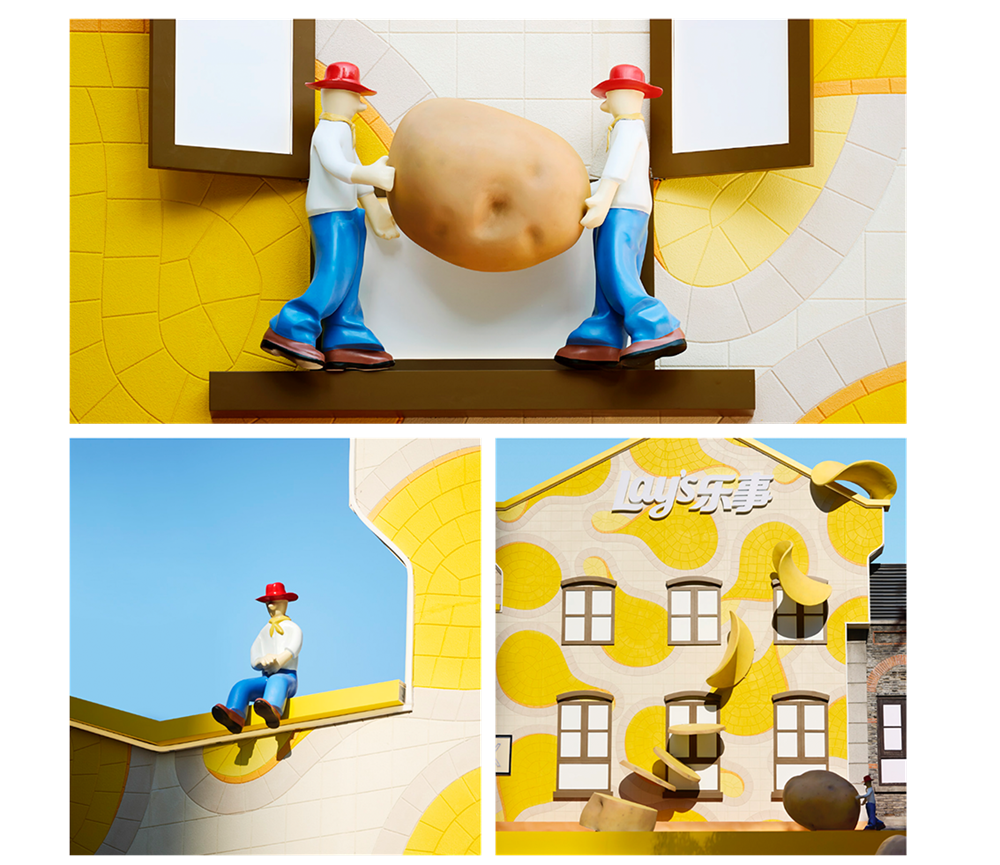 这份先锋美学巧思,更以跨界共创的形态渗透进空间各处。乐事携手时尚设计师品牌8ON8,共同打造极具动态张力的艺术装置:餐厅外立面上,趣味鲜活的小人形象,生动演绎着从土豆到薯片的奇妙转变。他们或搬运土豆或惬意休憩,仿佛为这场土豆盛宴奏响欢快序曲,自然引领食客开启美味探索之旅。