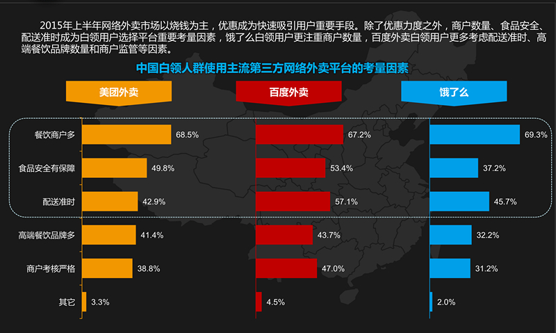 这其实说明了,白领的需求并非仅仅只是需要外卖、解决时间问题,在解决时间问题之外,白领用户对于餐饮的质量,诸如包装安全、物流速度、冷热保温,都有着更高的要求。想比之下正如打车O2O一样,早期的打车O2O用户只需要用手机打到车就心满意足,但是随着市场的发展,用户更多想要优质的乘车体验被发掘了出来,专车相对于出租车,车主的素质更高,更有安全性,因此对出行服务有更高追求的用户选择了专车出行。而外卖也是如此,在早期“吃什么”解决之后,白领用户也向“吃的好”的需求衍生。