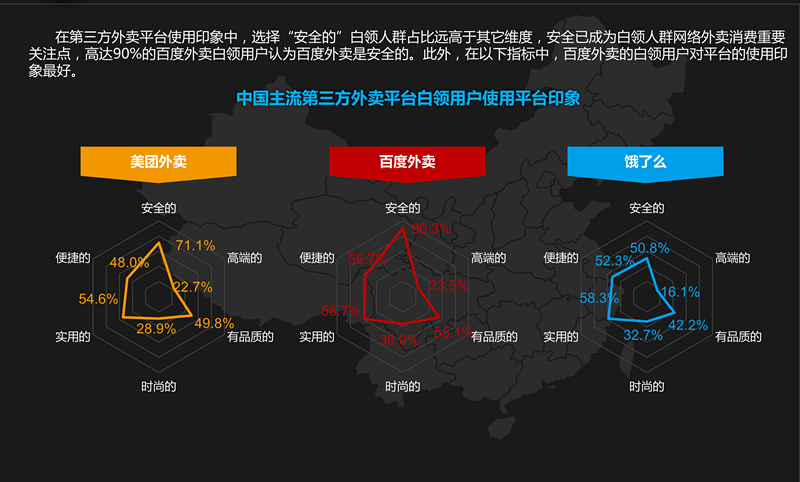 对于外卖用户而言,配送快并不是唯一的诉求,配送准时反而更重要。目前,这个需求在白领人群中越来越突出,而从三大外卖平台的表现来看,百度外卖明显做的更好一些,这可能源于其智能物流调度系统,可以准确识别订单对于配送时间的需求。