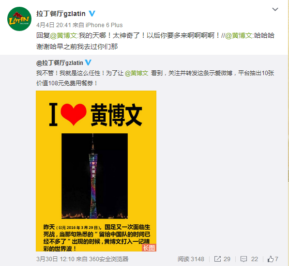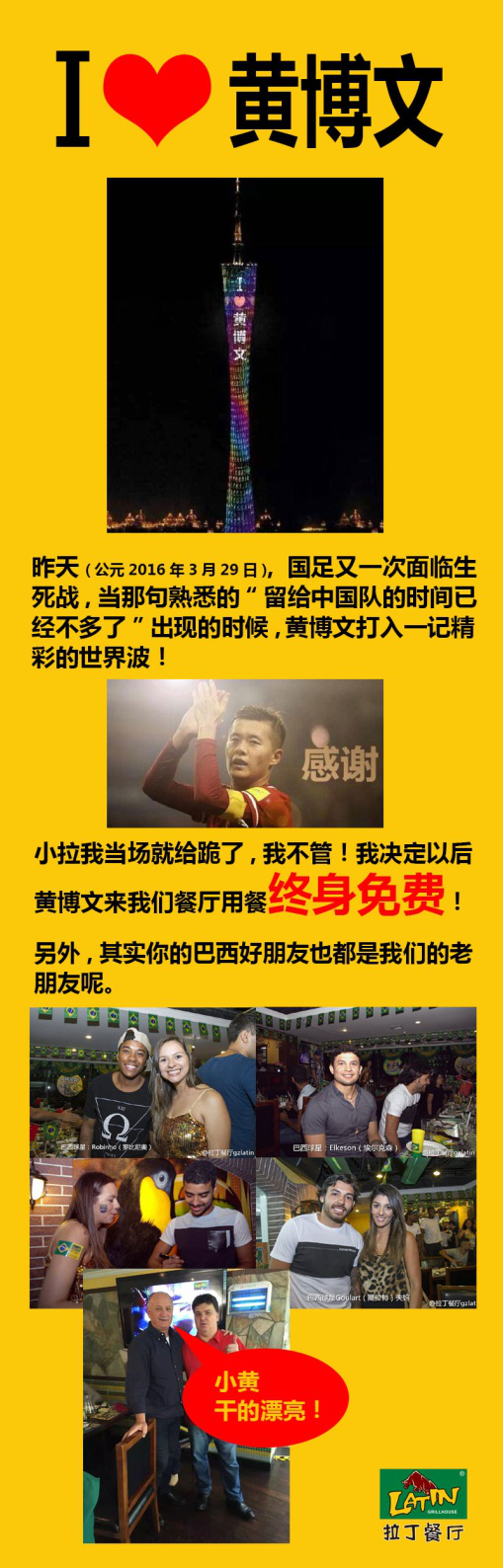 3月29日,中国男足在大部分球迷都绝望的时候成功打入世界杯亚洲区十二强复赛,广州恒大球员黄博文打入关键一球。广州拉丁餐厅发布了这样一条微博: