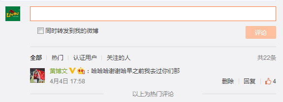 这条微博最终在4月4日让黄博文看到,并回复表示感谢。