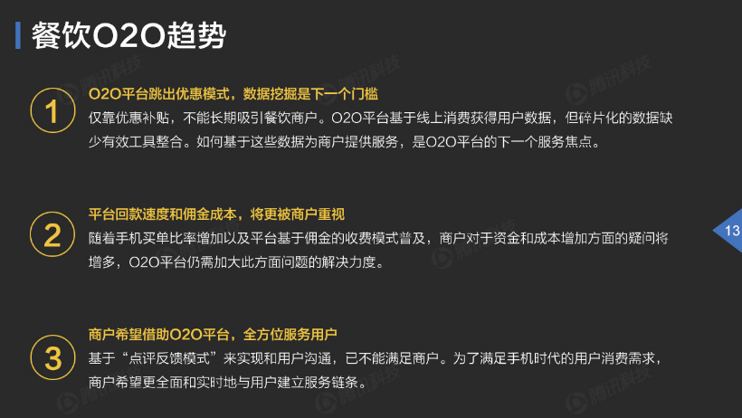 报告还称,以优惠和补贴建立的合作模式引起商家的担忧,即以低价吸引的曝光是否能长期维持,基于点评反馈模式的用户沟通,也已不能满足商户。商户期待更具可持续价值的合作方式,目前看来,如何基于用户的消费数据为商户提供服务,帮助商家更全面实时地与用户建立服务链条,将是O2O平台的下一个焦点
