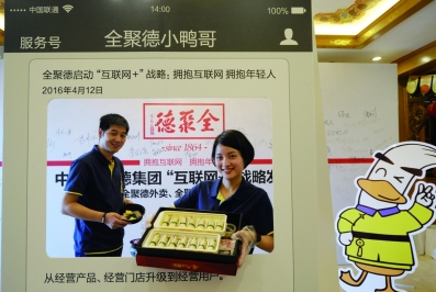 昨日,全聚德集团正式发布“互联网+”战略,即利用好全聚德的百年老字号品牌、完整的供应链体系、百年工匠烤鸭技艺以及丰富的线下门店布局等独特的资源,从经营产品、经营门店,同期启动用户经营计划,利用互联网工具和互联网思维全面拥抱互联网、拥抱年轻人。