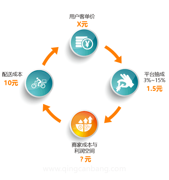 以客单价30元为例,商家成本与利润空间=客单价30元(用户消费)-平台抽成1.5元(3-15%平台引流、运营投入)-配送10元(平均每单8-12元)= 19.5元。
