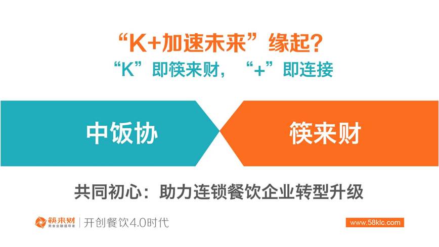 李宏文称:“K+加速未来”计划是应时应需而生。所谓“K”即筷来财,“+”即连接。“K+加速未来”计划通过中饭协和筷来财的合作,连接中国餐饮市场上150万家连锁餐饮企业,连接200万+连锁餐厅,连接600万家食材供应商,连接1000万+的个人投资者,充分发挥中饭协全国性行业组织和筷来财餐饮业公共服务基础设施的作用,助推餐饮企业完成升级转型,促进餐饮产业的可持续发展。