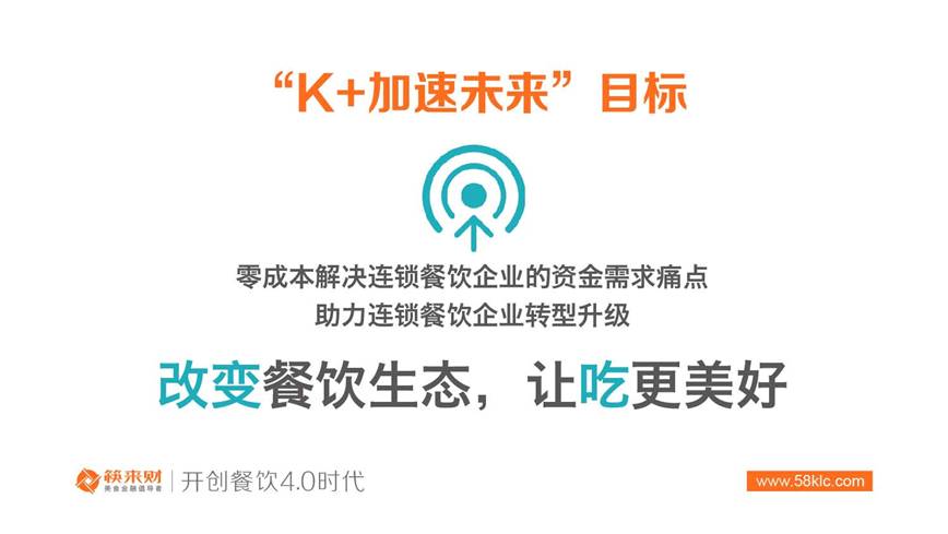 “K+ 加速未来”连锁餐饮企业金融助推计划旨在以零成本解决连锁餐饮企业的资金需求痛点,助力连锁餐饮企业转型升级,提升竞争能力。该计划的核心内容包括如下三点: