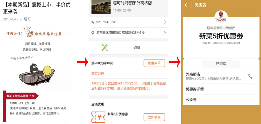 塔可在微信后台内投放了1000张15元代金券(消费满100元即可使用)。首次关注公众号便可领取。半个月内共被领取了 700张,领取率达70%。