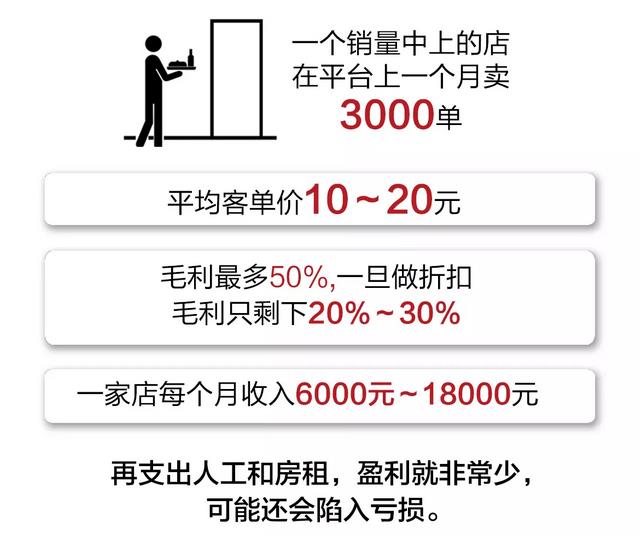 某家店参加满二十五减十几的活动,一个月卖了将近二十万,最后纯利润只有一万五左右。包装成本一万,加上人员工资,最后还是赔的。“事实上,在当前纯外卖市场上,真正能挣钱的商家非常少。”某不愿具名的外卖品牌负责人说。