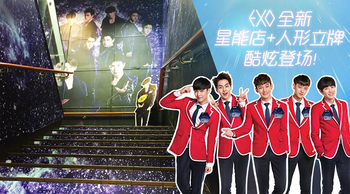 瞄准年轻人群体的肯德基2015年邀请韩国超人气团体EXO作为代言人,与此同时还在北京、上海、广州、成都、青岛、武汉打造6家星能店,这些门店播放的是EXO歌曲、墙是3D合影墙、还有行星饭留言墙,随处都可见EXO元素。