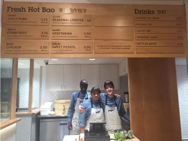 笔者发现,美国店的装修风格非常简约。顾客可以隔着玻璃观看包子是怎么做出来的。菜单上不仅有 经典猪肉包、咖喱牛肉包、酱烧鸡丁包、香菇青菜包、鲜橙红薯包,还有当地特色的龙虾包。