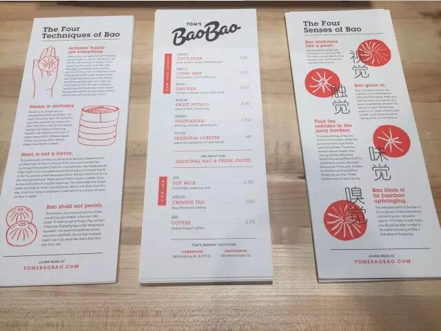因为很多老外还不太了解包子,所以,美国店的点单台会放三份说明,顾客可以按需取阅。一份关于包包的工艺,一份是菜单,一份是包子的四种感觉:视觉、触觉、味觉、嗅觉。据了解,在正式开业前,TOM'S BAOBAO还会进行定向邀请试吃活动,试营业为期一周。