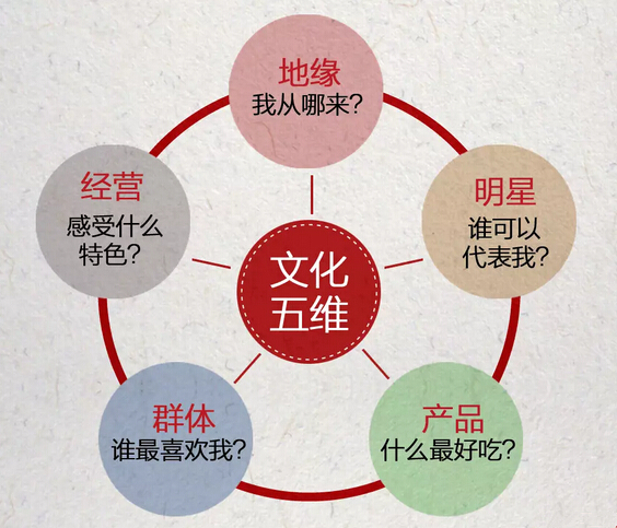 五维文化和视觉整合,是文创餐饮中间层的设计,往上接住“三个打通”,往下落地成“六感体验”。
