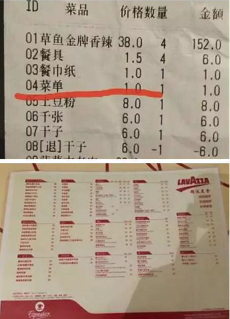 日前,有市民在镇江市某家烤鱼店就餐时遭遇堵心事。原本开心的饭局,但结账时看到账单上的一项名目赫然写着“菜单”二字,收费一元。这让人讶异不已,以前只知道有些餐厅收取消毒费、蘸料费等,但长这么大还是头回听说菜单也收费!更有网友吐槽“以后餐馆的桌椅是不是也会加入收费行列了?”