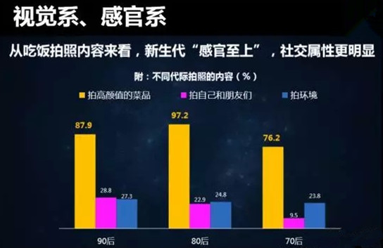 因此可见,在外就餐照片的共享已经成为新生代圈子里重要的互动方式之一。90后是追求全方位感官刺激的视觉系群体,而且他们觉得吃饭这个事情就是要和玩到一起去,他们更注重有人情味的和好玩的方式。