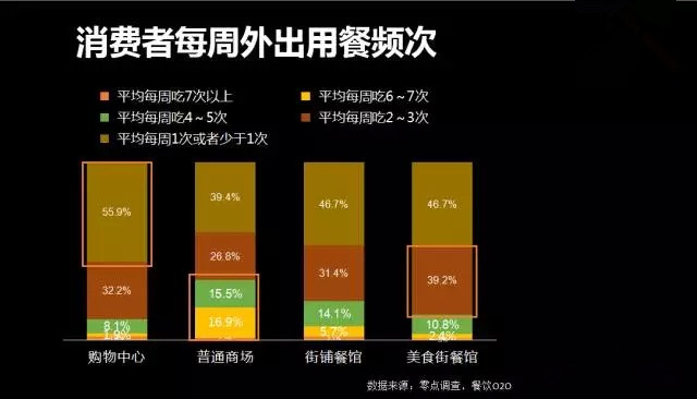 1、56%的每周至少一次去购物中心用餐,说明购物中心是首选,其它场所也有近50%