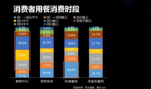 2、购物中心餐饮消费时段集中在周五晚至周六晚和节假日,占比近75%,周日和平时人流下滑。购物中心是馅饼还是陷阱?