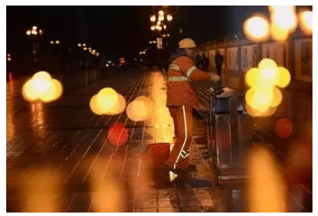 微弱的灯光下,他们认真清扫着脚下的每一段路