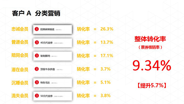 来看一个客户案例,假如进行无差异化营销,对所有会员统一发送50元代金券,那它的转换率只有3.64%。接着对所有会员进行分类,对每一类会员采取不一样的营销方式。忠诚会员采用的是招牌菜式进行营销,对于忠诚会员来说,因为如果店内的美食对他没有吸引力的话那他就不是忠诚会员。普通会员对店内的招牌菜还未形成认知,所以采用40元的代金券策略。最终统计得知,整体票券的核销率达到了9.34%,提升了5.7%。这是因为会员营销是个性化的,才能够有这么高的转化率。