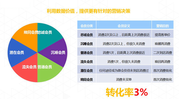 会员活跃分成两步:消费者分析、精准营销。我们对消费者进行个性化的分析,从消费能力、消费频率等方面描绘消费者画像,对所有粉丝进行了分类:第一类是忠诚会员,第二类是沉睡会员,第三是普通会员,第四是流失会员,第五是潜在会员,第六是陪同会员。我们对会员进行分类定义,每一类会员的营销目的是不一样的,每一类会员的营销方式也不一样。