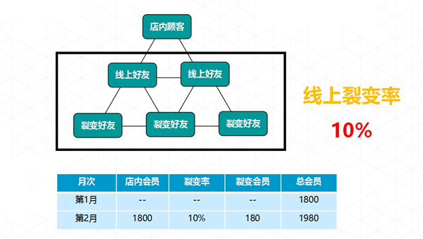 线上的裂变,是互联网会员最大的优势,对于店内的粉丝大家非常清楚,店内的粉丝在线上还有好友,他的好友也能帮你裂变,这等于是帮助所有的餐企在传播店内的信息。如果这个月积累了1800个会员粉丝,线上获取的是10%的会员裂变,如果懂得社交,在前期进行会员营销,有可能百分之百翻倍,当想吸粉的时候,获得的粉丝是1800元,其实是有机会新增10%的,要知道到后面比例数会降低,10%是拿最低概率值而已。