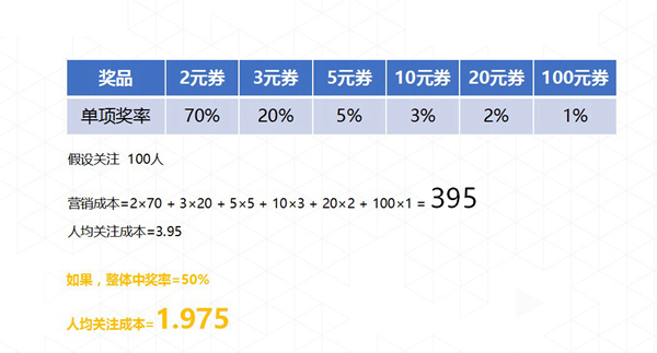 以往的会员,可能大家都会看到扫码优惠,比如扫码关注赢得100元代金券,这是怎么玩的呢?我们在系统后面设计合理的机制,获得100元代金券是一个概率,不是每个人都有的,有可能是1%的人才有机会获得。其他人都是以抽奖的行为获取这张代金券的。对于产品的设置,100元的代金券可能只有1%的人可以获取到,对于2元的代金券有70%的机会获得。如果100人关注,整体成本是395,人均成本就是3.95元。如果整体参与率是50%,那人均成本就更低。