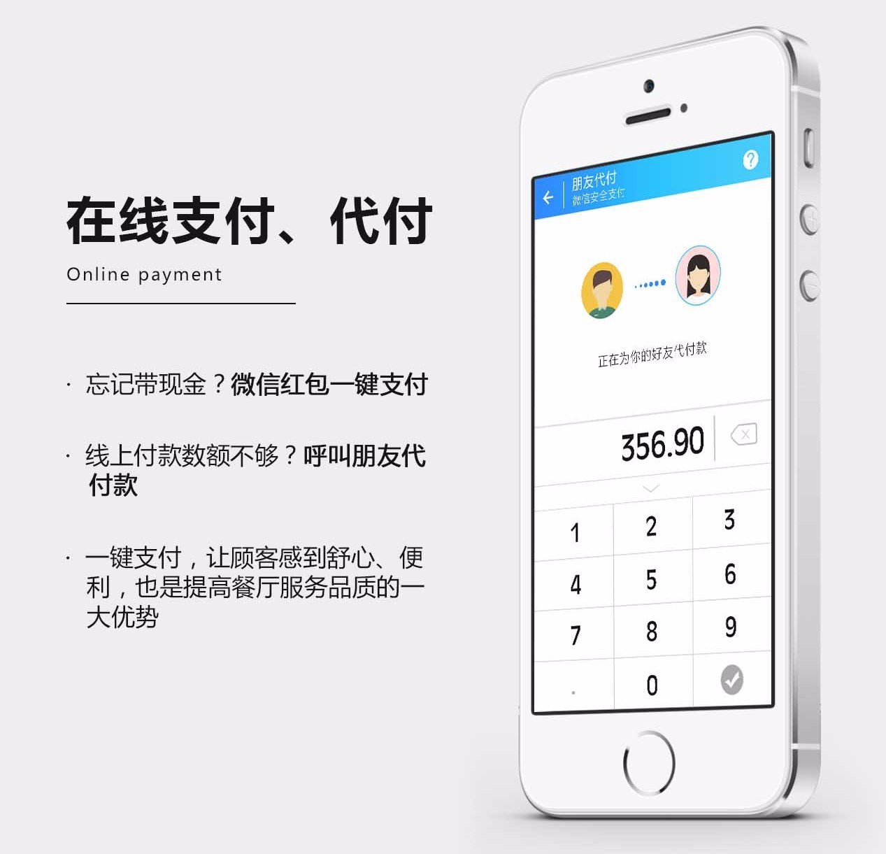 3、服务员无需全程跟单结账,顾客在线支付,减少人工成本;