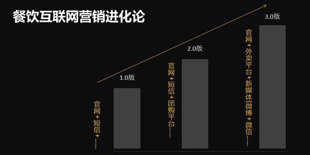 随着这些改变,我们也越来越能看清餐饮营销的发展进化过程:从官网+短信的1.0版本,发展到官网+短信+团购的2.0版本,再进化到如今的官网+外卖+新媒体的3.0版本。
