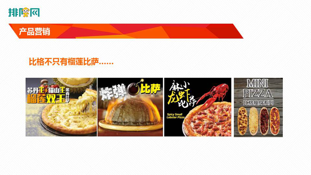 1.产品营销。我们梳理出我们的爆品是榴莲比萨,所以我们在2016年推出了“比格不只有榴莲比萨……”口号。口号推出后仅仅20多天,北京所有门店同店同比销售额增加了20%。