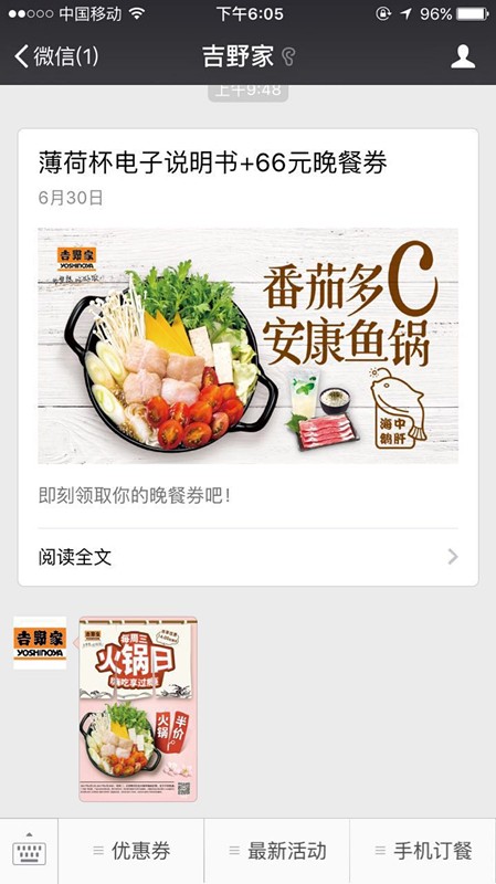 现在已有很多经营者懂得用微信公众号去进行营销,培养粉丝,定期推送餐品信息,活动信息等。用户一关注公众号即可领取优惠券,查看最新活动,使用自助点餐功能。定期结合热点策划推送活动信息、餐饮信息给粉丝,粉丝可以在微信实时评论,与微信运营者保持良好互动。