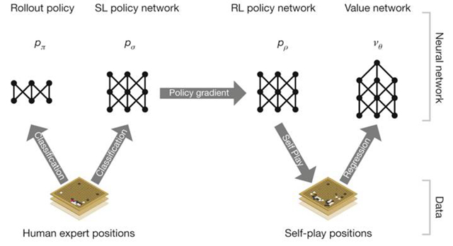 ▲AlphaGo 使用两种人工神经网络进行学习:预测网络(policy network)和评估网络(value network)。