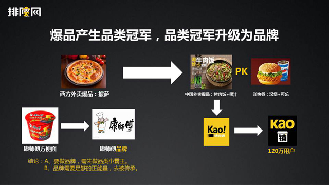 那么在新的阶段我猜想可能是寿司。寿司类有可能是下一阶段的爆品。当然,我是指外卖方面的爆品。为什么这样讲?我们认为,爆品能够产生品类的小霸王。但是品类的小霸王之后会产生品牌。比如我们熟知的康师傅方便面。人们认知它的时候就是知道康师傅是方便面的小霸王。现在,康师傅已经不仅仅是方便面,还有饼干、水,还有其它一些东西。