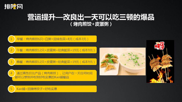 但是,你想想吃一顿烤肉饭呢?那就只能中午去吃了。所以KAO铺第二阶段是主推烤肉煎饺的这一个爆品,然后不断去传播,从而让我们的用户量获取不会吃亏。