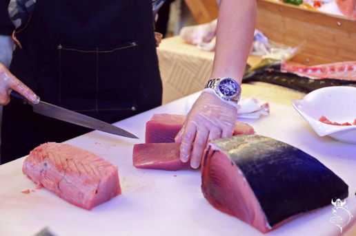 开鱼秀的主角大目金枪鱼,更是从太平洋远道而来。大目金枪鱼生活在水深100-400米的大洋深处,是金枪鱼中的一个类别,与蓝鳍金枪鱼相似。尝过大目金枪鱼的都知道,其肉质绵柔,口感更为软嫩,是各大海鲜日料馆选用最多的一种金枪鱼。身为堂食刺身与外卖刺身的专家更是必不可少了。开鱼秀是由拥有丰富经验的大厨主持,看他熟练精准的开鱼刀法,也是一场盛大的视觉享受。