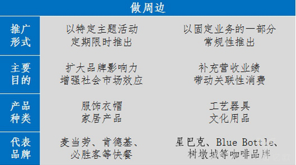 不过,由于国内餐饮品牌的经营思路仍较为单一、传统,因此“周边”的概念仍主要在国外的餐饮品牌上得到充足表现。从他们的业务来看,大致分为两种“周边”的发展模式。
